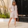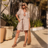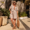 A camisa de manga 3/4 possui fechamento frontal por botões e detalhe de martingale nas mangas, trazendo um toque casual-chique. O short, com cintura elástica garante conforto e caimento perfeito, tornando o conjunto ideal para dias descontraídos com sofisticação.