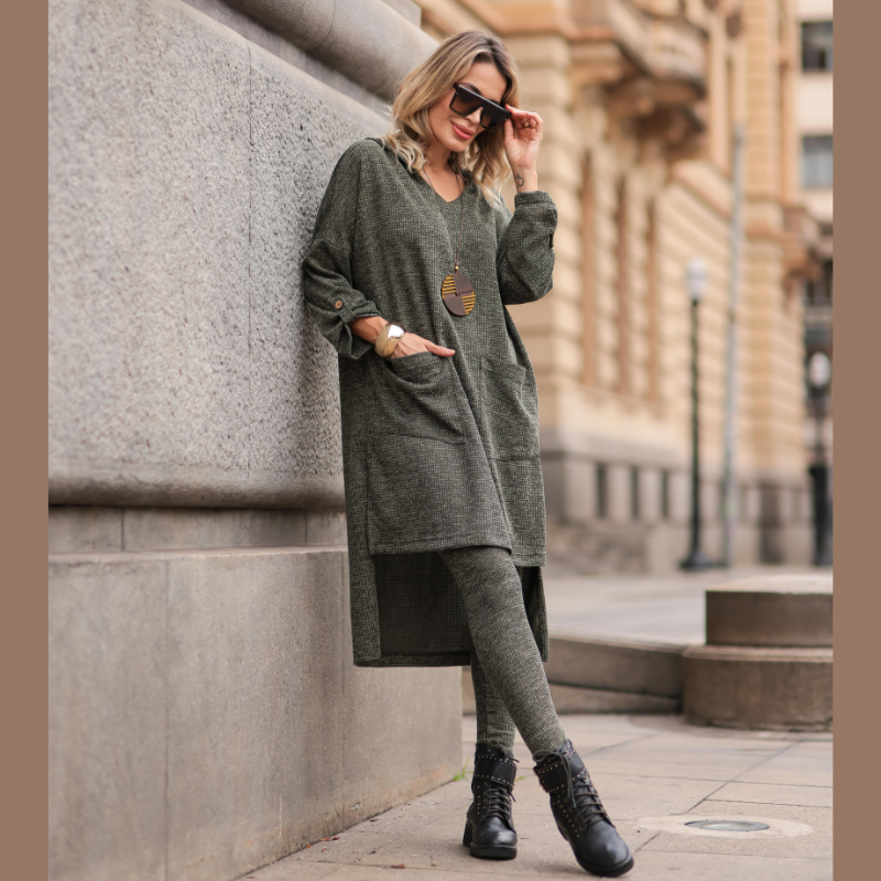 O Conjunto Samira traz praticidade, elegância e conforto em uma só peça! Confeccionado em tecido de lanzinha leve e aconchegante, é ideal para os dias mais frescos. A blusa alongada com corte assimétrico oferece um visual moderno, enquanto a calça legging proporciona liberdade de movimento com muito estilo. Indicado para uso casual, trabalho, passeios ou viagens com conforto garantido.
