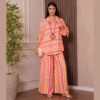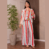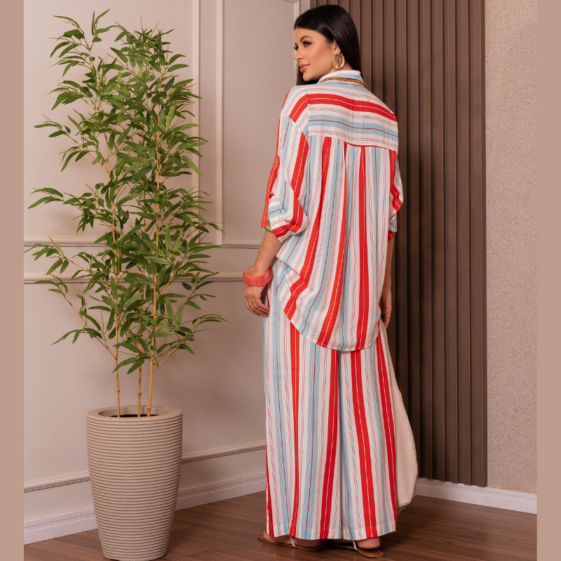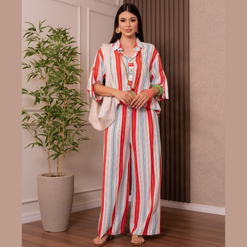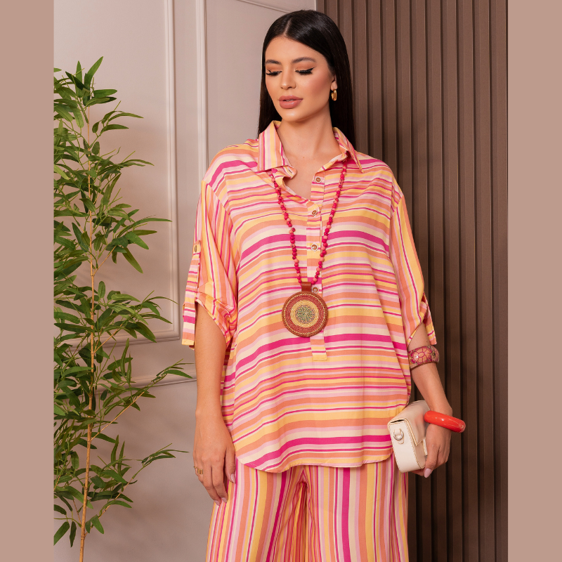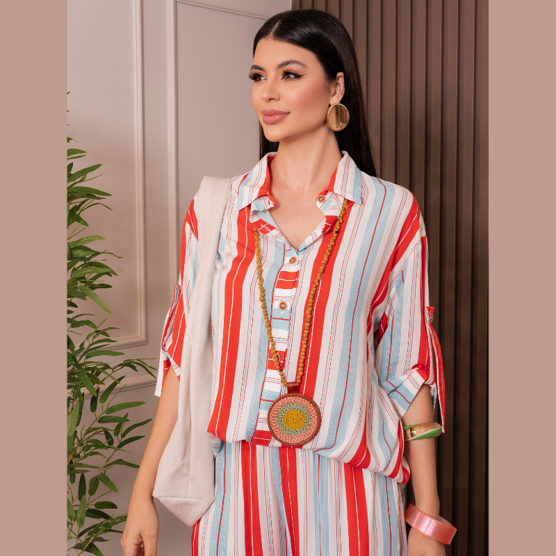 Para quem busca um visual leve e vibrante, o Conjunto Zayra combina conforto e estilo em uma proposta moderna e cheia de personalidade. Confeccionado em tecido leve e fluido, o conjunto apresenta estampa listrada em tons quentes, que trazem alegria e sofisticação ao look. A blusa possui modelagem ampla, gola lapela e mangas 3/4 com detalhe em martingale, conferindo um toque despojado e elegante. Já a calça de cintura alta e modelagem pantalona proporciona caimento perfeito e movimento natural, ideal para dias de calor ou ocasiões casuais com charme. Perfeito para quem valoriza praticidade e elegância em um único visual, o Conjunto Zayra transita facilmente entre o casual chic e o resort wear.